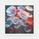 Une collection de coquelicots stylisés avec pétales translucides dans les tons bleu, rouge et blanc sur un arrière - plan noir