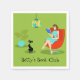 Ces serviettes en papier de femme personnalisables Retro Reading présentent un style années 60, un art minimaliste, un dessin animé d'une femme qui a ses priorités dans l'ordre. Ce délicieux ver de livres est entrainé dans un vrai tourneur de page. La brunette, toute en forme, porte une robe d'aqua et des lunettes rouges, tout en tenant un livre bleu. Elle est assise dans une chaise confortable aux oeufs rouges. Devant elle, un chat noir élégant dans un col turquoise profite de la tranquillité qui vient de vivre avec un bibliophile. Femme et chat sont tous deux dans une élégante chambre verte. Au-dessus, une lampe pendentif kitsch dans les tons jaune et turquoise. Sur le côté, un plante luxuriant, tropical, en pots, est installé dans un aqua fleuri. Kitty, si vous avez besoin de quelque chose, vous devrez attendre jusqu'à ce qu'elle finisse ce chapitre ! Personnalisez ces serviettes pour votre occasion spéciale !