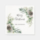 Un arrière - plan blanc. Décoré de sources de pin et de cônes. Personnalisez et ajoutez votre nom de famille. Texte : Joyeux Noël.