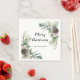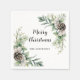 Un arrière - plan blanc. Décoré de sources de pin et de cônes. Personnalisez et ajoutez votre nom de famille. Texte : Joyeux Noël.
