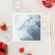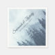 Ces belles serviettes mariages sont décorées dans un style simple, élégant et rustique. L'illustration décalée ou placée en diagonale est conçue de telle sorte que la serviette se lit debout lorsqu'elle est maintenue à un angle de 45 degrés. Il présente une scène extérieure d'une montagne accidentée couverte d'épinettes bleues ou de pins. Il y a de la place pour les noms du couple et la date du mariage.