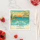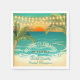 Des palmiers et des lampes à cordes encadrent le coucher de soleil de l'océan et la rive sablonneuse sur cette belle plage de mariage Papier serviettes. Customisez le texte moderne et élégant avec vos informations de mariage.