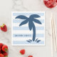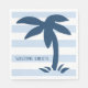 Jolies serviettes en papier avec un palmier poêlé et rayures bleues et blanches. Le texte dit "Bienvenue aux invités". Très agréable pour vos réunions d'été. Idéal pour la décoration de cuisine côtière.