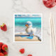 Un canard blanc et moelleux se dresse sur une plage de sable, portant des palmes bleues et des lunettes de plongée
