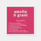 Serviettes mariages de style moderne avec un agencement simple et minimal avec vos noms dans une police rétro super ainsi qu'une liste de faits amusants sur la mariée et le marié. Les couleurs vives sont le rose Viva Magenta vivant. Les polices / couleurs peuvent être modifiées dans l'outil d'édition de conception. Ces serviettes amusantes ajoutent un élément amusant à votre réception de mariage, à votre fête de fiançailles ou à votre douche nuptiale.