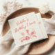 Comme vous voyez cette serviette unique et élégante pour dîner d'anniversaire a un modèle bien conçu. Avec la vaisselle de brunch dessinée à la main rouge de crêpes, bouquet floral, bougies, gâteau, bouteille de vin et verre, raisins, couteau et fourchette et nom manuscrit fantaisiste. Tout sur arrière - plan crème. Vous pouvez facilement customiser en cliquant sur le bouton de personnalisation.
