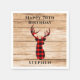 Thème de chasse rustique pour 70ème anniversaire (changement à tout âge). Silhouette de cerf en plaid de buffle noir et rouge. Bois rustique en arrière - plan. Customisez avec l'âge et le nom du garçon (ou de la fille !) d'anniversaire. Parfait pour ceux qui aiment l'extérieur et la chasse.