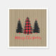 Rustic farmhouse holiday design fea trio of Evergreen tree silhouettes, one in red and black buffalo plaid, texte "Merry Christmas" in solive red, et a muted vintage striped background
