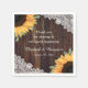 Décorez votre fête de mariage rustique avec ces élégantes serviettes de mariage botanique ornées de tournesols et de verdure sur un arrière - plan en bois et dentelle orné de lampes à cordes.