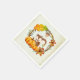Une serviette en papier avec un mignon écureuil debout derrière quelques citrouilles orange aquarelle. Une couronne de feuillage les entoure d'une feuille de chêne et de fleurs d'orange et d'autres sprigs et feuilles. Arrière - plan est une image numérique parchemin vintage.