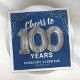 Élégantes serviettes de fête du 100e anniversaire avec un arrière - plan bleu élégant qui peut être changé à n'importe quelle couleur, parties scintillant brillante argent, le dicton "encourage à 100 ans" en utilisant un hélium hundered ballons en argent, leur nom, et la date de la célébration.