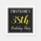 Cette conception simple et élégante de serviette en papier comporte un message comme "la fête du 38e anniversaire de FirstName", avec le "38e" en texte jaune soigné, dans une zone carré de couleur noire avec un contour de bordure simple. Un nom personnalisé peut être utilisé. Des serviettes comme celles-ci pourraient être utilisées à une fête d'anniversaire pour quelqu'un qui célèbre son trente-huitième anniversaire. [~Z0000150]
