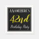Cette conception simple et élégante de serviette en papier comporte un message comme "ANameHere’s 42nd Birthday Party", avec le "42nd" en texte jaune raffiné, dans une zone de couleur noire carré avec un contour de bordure simple. Le nom peut être customisé. Des serviettes comme celles-ci pourraient être utilisées à une fête d'anniversaire pour quelqu'un qui célèbre son quarante-deuxième anniversaire. [~Z0000150]