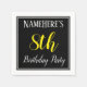 Cette conception simple et élégante de serviette en papier comporte un message comme "NameHere’s 8th Birthday Party", avec le "8th" dans un texte de couleur jaune raffiné, dans une zone carré de couleur noire avec un contour de bordure simple. Un nom personnalisé peut être utilisé. Des serviettes comme celles-ci pourraient être utilisées à une fête d'anniversaire pour quelqu'un qui célèbre son huitième anniversaire. [~Z0000150]