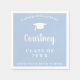 Des serviettes modernes de remise de diplômes avec "Félicitations" et un casquette de grade au-dessus du nom du diplômé dans une écriture élégante épaisse avec le nom de l'année de classe et le nom de l'école en blanc sur un arrière - plan bleu pastel. L'arrière - plan peut être changé en n'importe quelle couleur. Ces serviettes sont une excellente façon d'ajouter une touche personnelle à votre fête de remise des diplômes.