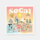 Une scène lumineuse et colorée offre une vue spectaculaire de la Californie du Sud - personnages farfelus sur la plage et le désert de SoCal présentant les parcs de Los Angeles, Orange County, San Diego, Père Noël Barbara, Riverside, Palm Springs, El Centro, Salton Sea, Anza Borrego et Joshua Tree ainsi que les villes frontalières de Tijuana, Tecate et Mexicali. Cette charmante scène a tout - un surfeur pend dix tandis qu'un orque saute de l'eau, des animaux de zoo accueillent les touristes, les amateurs de vin font un toast comme un randonneur est remarqué par un OVNI et bien plus encore...
