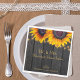 Script de typographie or rustique M. et Mme mariage serviettes en papier personnalisées avec de beaux tournesols sur un arrière - plan en bois brun foncé avec des lampes à cordes. Idéal pour votre nuit d'été ou d'automne élégant jardin de campagne rustique ou de ferme mariages à thème, les renouvellements de malheur ou les anniversaires de couple.