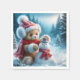 Un ours en peluche brun dans un casquette, des oreilles et une écharpe rouge construit un petit bonhomme de neige dans une forêt d'hiver