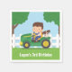 Des serviettes de fête mignonnes avec un garçon conduisant un tracteur vert tandis que le petit chien chiot aime le trajet. Arrière - plan agricole de clôtures et d'arbres. Idéal comme fournitures de fête pour une fête d'anniversaire sur le thème tracteur. Ajoutez un message dans le modèle texte fourni.