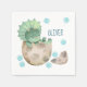 Les serviettes de baby shower à thème jurassique présentent un triceratops dinosaure hachant d'un oeuf avec des accents de traces de dinosaures bleues et un nom qui peut être personnalisé. Art par KL Stock
