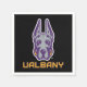Le logo de la mascotte de l'Université d'Albany Great Dane présente une représentation stylisée de la tête d'un grand Danois. Le chien est illustré de lignes vives et audacieuses en violet et gris, lui donnant une expression féroce et confiante. Les oreilles sont hautes, symbolisant la vigilance et la force. Sous la tête du Grand Danois se trouve le mot "UAlbany" écrit en caractères d'or gras et bloquants, surligné de violet, renforçant l'image de marque de l'université. Cette conception représente les équipes sportives d'UAlbany, mettant en avant le pouvoir, la loyauté et la détermination.