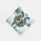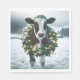 Une vache dans un pâturage d'hiver portant une couronne verte de Noël avec des lumières brillantes