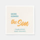 Cette serviette de baby shower au thème du soleil est décorée d'un soleil coloré et d'une typographie élégante sur un arrière - plan crème. Le texte est personnalisable. Aquarelle originale © Michele Davies.