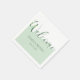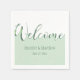 Bienvenue dans un texte de calligraphie orné avec une superposition de feuilles d'eucalyptus divise vos serviettes. Blanc en haut et vert doux en bas. Votre nom et votre date sont dans une teinte de vert foncé