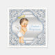 Serviettes de baptême de garçon avec un adorable bébé ange sur un beau fond tourbillonnant bleu et argent. Vous pouvez personnaliser avec le texte de votre choix.