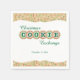 Cette serviette jetable Christmas Cookie Exchange présente un arrière - plan marron accentué de sauterelles rouges, vertes et blanches pour ressembler à un biscuit. Une forme de crochet blanc au centre comporte du texte personnalisable. Le mot "cookie" sur la serviette est accentué par des biscuits à pétoncles avec un gel et des arrosages rouge et vert clair.