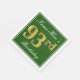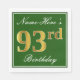Cette conception simple et élégante de serviette en papier comporte un message comme "Name-Here’s 93rd Birthday" (avec le "93rd" ayant une fausse couleur dorée) dans une zone carré de couleur verte avec un contour de bordure simple. Le nom est dans un texte de type script de couleur blanche, et peut être customisé. Des serviettes comme celles-ci pourraient peut-être être utilisées à une fête d'anniversaire pour quelqu'un qui célèbre son quatre-vingt-treize anniversaire. [~Z0000137]