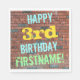Cette conception amusante de serviette en papier sur le thème de l'anniversaire comporte un message comme "HAPPY 3rd BIRTHDAY, FIRSTNAME!", où le nom peut être personnalisé. L'arrière - plan est représenté par un mur en brique composé de briques de couleur rougeâtre. Le texte du message personnalisable comporte des couleurs comme le bleu, le jaune et le vert, et il a un aspect inspiré de celui des graffitis peints. Des serviettes comme celles-ci pourraient être utilisées à une fête d'anniversaire pour quelqu'un qui célèbre son troisième anniversaire. [~Z0000271]