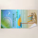 Une belle serviette avec une image relaxante et colorée d'une plage tropicale.