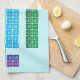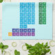Serviette de cuisine avec tableau périodique des éléments, chaque groupe d'éléments marqué en couleurs arc-en-ciel.