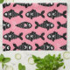 Un motif de poisson moderne et amusant à imprimer en bloc avec des rangées de poissons noirs sur un arrière - plan rose doux avec des pops occasionnels de queues roses. Un cadeau de serviette de thé idéal pour les amoureux de la vie marine! Petite échelle. Disponible dans d'autres couleurs