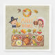 Des serviettes en papier avec une illustration Thanksgiving - un pèlerin et natif avec de nombreux dessins thématiques d'action de grâce. Une table avec un festin glorieux de dinde, des feuilles d'automne et une couronne. Le texte dit "Merci beaucoup". Placer sur un arrière - plan bronzé avec un motif damassé.