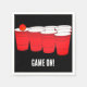 Serviettes de fête en papier avec image de tasses rouges dans le jeu de bières pong contre un arrière - plan noir.