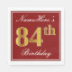 Cette conception simple et élégante de serviette en papier comporte un message comme "NameHere’s 84th Birthday" (avec le "84th" ayant une fausse couleur dorée) dans une zone carré de couleur rouge avec un contour de bordure simple. Le nom est dans un texte de type script de couleur blanche, et peut être personnalisé. Des serviettes comme celles-ci pourraient peut-être être utilisées à une fête d'anniversaire pour quelqu'un qui célèbre son quatre-vingt-quatrième anniversaire. [~Z0000138]
