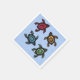 Cette serviette en papier de la taille d'un cocktail est d'un bleu clair avec un groupe de quatre tortues abstraites noires festives chacune avec une coquille colorée différente.