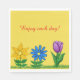 Jolies fleurs dans l'herbe verte du jardin avec fleur jaune doré, fleur jaune bleu et tulipe violet avec feuilles verts. Avec le libellé, Profitez chaque jour écrit en écriture rouge. Des serviettes en papier jetables amusantes et gaies à utiliser pendant le printemps et l'été pour un bonjour accueillant. Laissez le libellé ou personnalisez-le ou supprimez le texte. Montré sur un arrière - plan jaune. Oeuvre graphique originale de TamiraZDesigns.