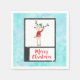 Des serviettes en papier avec une jolie illustration fantaisiste d'un drôle de renne de Noël dans un pull moche, parfait pour la saison des fêtes. Il se tient debout sur 2 jambes et brave bonjour. Il a de gros bois et un mignon casquette d'hiver tricoté vert. Texte ci-dessous dit Joyeux Noël dans une police manuscrite dans une couleur rouge festive. L'arrière - plan est un design d'aquarelle bleu glacé à l'aspect aquarelle.