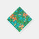 Serviettes en papier dans un William Morris, Art Nouveau, impression textile d'iris et de feuilles, numériquement rehaussées et colorées, en orange, vert citron et douce aqua, sur un arrière - plan profond turquoise