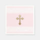 Serviettes en papier croisé rose-arrière - plan rose solide avec croix métallique en faux or au centre. La couleur rose arrière - plan peut être changée en n'importe quelle couleur. Bordé en haut et en bas avec de la dentelle blanche imitation florale. Note : Toutes les images sont imprimées. Pas de dentelle réelle ou métallique. Belles serviettes en papier religieuses parfaites pour les baptêmes, communions, dédicaces et Pâques. Coordonner les invitations au baptême rose et d'autres styles de serviette religieuse sont dans notre boutique Zazzle.com/angela65.