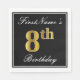 Cette conception simple et élégante de serviette en papier comporte un message comme "8e anniversaire du prénom" (avec le "8e" ayant une fausse couleur dorée) dans une zone carré de couleur noire avec un contour de bordure simple. Le nom est dans un texte de type script de couleur blanche, et peut être customisé. Des serviettes comme celles-ci pourraient être utilisées à une fête d'anniversaire pour quelqu'un qui célèbre son huitième anniversaire. [~Z0000136]