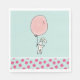Des serviettes en papier avec un lapin blanc fantaisiste tenant un gros ballon rose flottant dans l'air. Placez-vous sur un arrière - plan bleu clair. Le fond a un bordeur de pois roses cercles.
