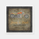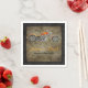 Serviettes en papier grungy conçues pour une moto ou un mariage thématique. Les serviettes comprennent l'image d'une motocyclette à hélico avec un travail de peinture à flammes orange et jaune imprimé sur un arrière - plan de vieux papier vintage encadré d'une texture asphaltée de route. Les serviettes sont composées d'un mélange de texte noir et orange. Il y a deux champs de texte modifiables pour ajouter des détails personnalisés de votre mariage.