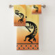 Serviettes de bain Sun Kokopelli de style sud-ouest. Serviette de bain Kokopelli couleur métal. Soleil jaune vif et combinaison de couleurs saumon et vives que vous pouvez customiser des couleurs arrière - plans pour correspondre à votre décor. Les cultures amérindiennes de Kokopelli. Attribué à des aliens anciens ou à l'art tribal et inspiré de dessins rupestres et rupestres. Customisez vos couleurs et styles de serviettes de bain de style sud-ouest Native American Desert Sun. Super idée cadeau.