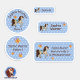 Hübsche wasserfeste Namensaufkleber für Mädchen. Set mit 24 verschiedenen eckigen und runden Namensaufklebern, Motiv Pony und Schmetterlinge auf blauen Sternchen-Hintergrund.