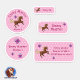 Hübsche wasserfeste Namensaufkleber für Mädchen. Set mit 24 verschiedenen eckigen und runden Namensaufklebern, Motiv Pony und Schmetterlinge auf rosa Sternchen-Hintergrund.