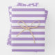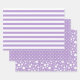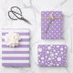 Drei Muster in Lavendel und Weiß: einfache Streifen, Polka Punkte und zufällige Flecken.